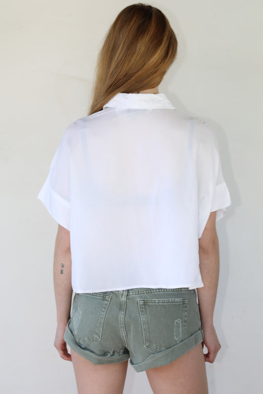 Cropped Short Sleeve Button-Down Shirt - White