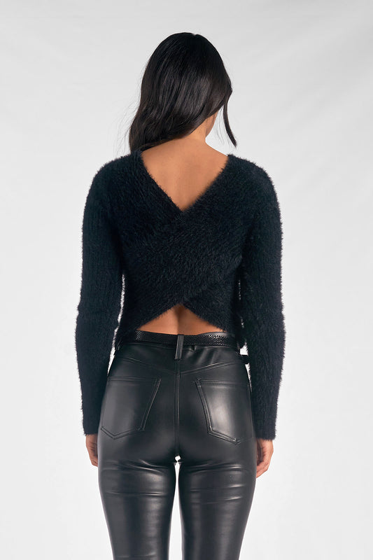 V-Neck Cutout Fuzzy Sweater - Black