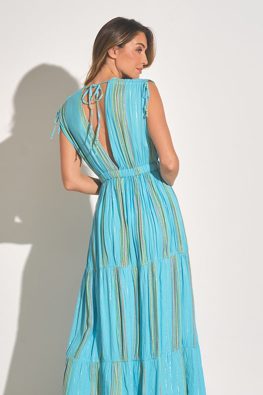 Deep V-Neck Maxi Dress - Aqua Lime Stripe
