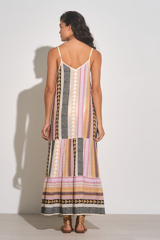 Spaghetti Strap Tiered Maxi Dress - Tan/Pink