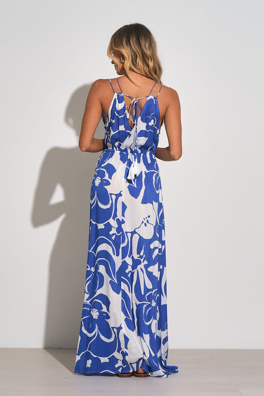 V-Neck Tie Back Maxi Dress - Blue Hibiscus