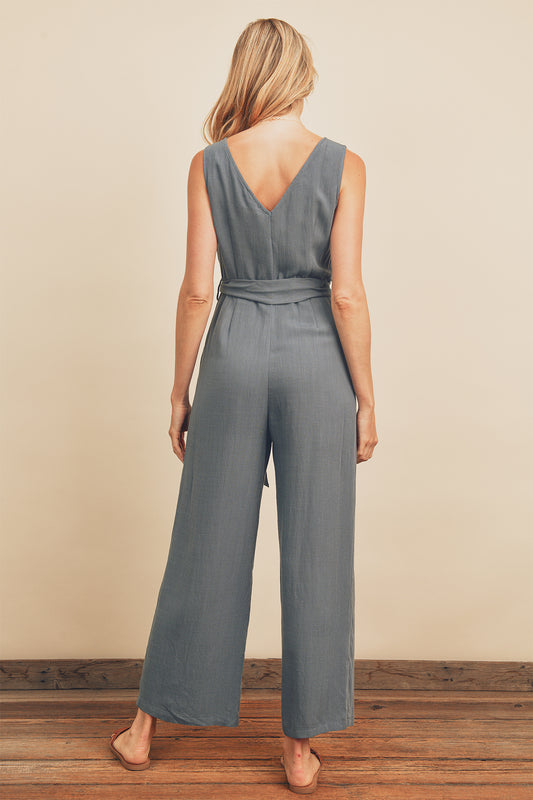 Button-Down Sash Belt Jumpsuit - Washed Teal