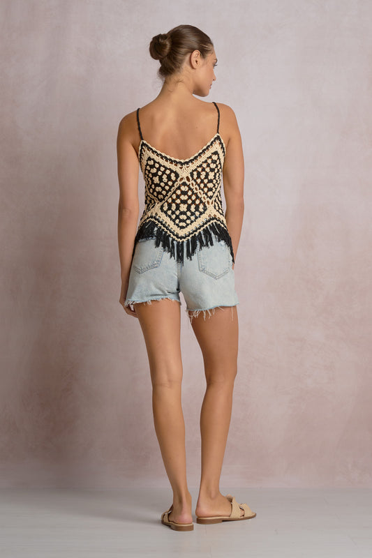 Crochet Tank Top with Fringe Bottom - Natural/Black