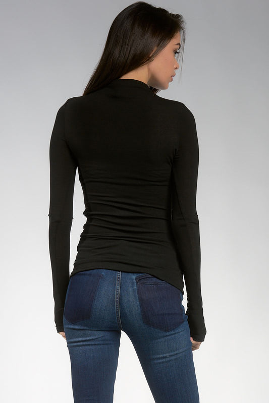 Long Sleeve Mock-Neck Ruched-Side Tee - Black