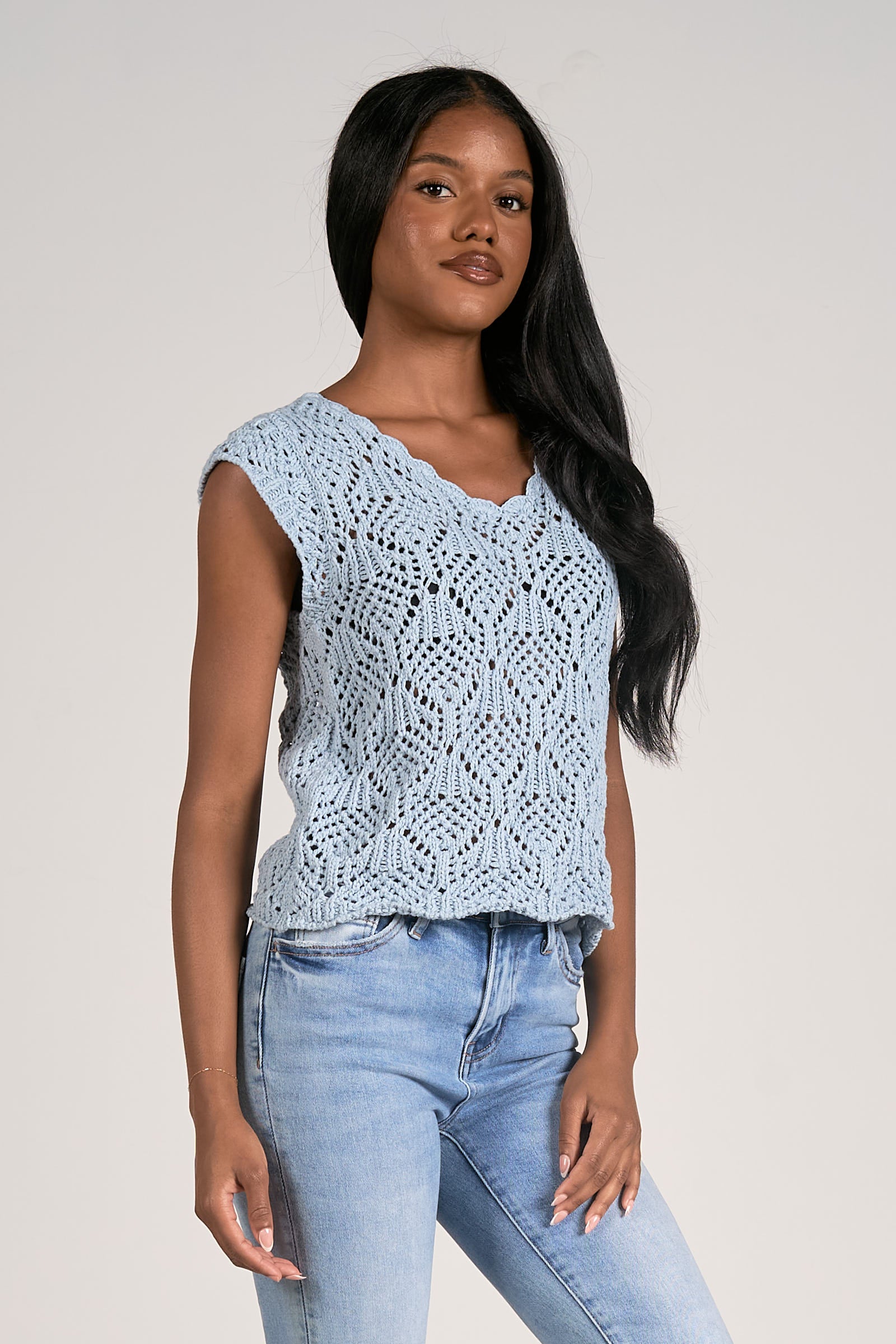 Cap Sleeve Crochet Sweater Tank Top - Blue